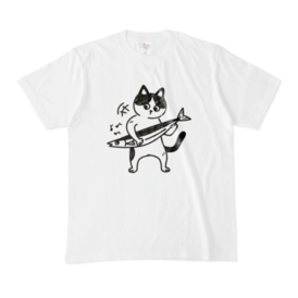 Tシャツ - XL - 白秋刀魚をゲットしたハチワレ君、 嬉しくてギターごっこ!