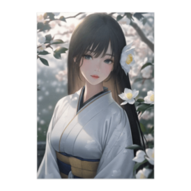 ポスター - B2この商品はpixivFACTORYで作られた商品です。サンプル画像は完成イメージのため、実物と異なる場合があります。 春の光に包まれた白椿と女性の微笑。 柔らかな色調が穏やかな時間を感じさせる一枚です。 心が落ち着く和の癒しポスター。