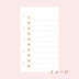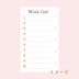 リフィル置き場【システム手帳】マイクロ5 ウィッシュリストダウンロード商品¥ 0無料ダウンロードウィッシュリスト.pdf (1.12 MB)「ギフトとして贈る」とはマイクロ5サイズシステム手帳のウィッシュリストリフィルです。 A4サイズの紙1枚分のPDF形式となります。 A4用紙に拡大・縮小なしで両面印刷(長辺とじ)をしたら、ガイドの点線で切り、穴を開けてご利用ください。 ガイド線は片面のみについています。 お使い頂けると嬉しいです! ※二次配布、販売、改変後の配布、自作発言等はおやめください。 ※日付などに誤りを見つけられましたら、申し訳ありませんがご連絡頂けると大変ありがたいです…内容 ①ウィッシュリスト 1〜100のウィッシュリストです。 やりたいことや、欲しいもの、達成したい目標など、お好きにお使いいただけます。 リフィル置き場素材(その他)【システム手帳】マイクロ5 マンスリースケジュール 2026/4〜2027/3リフィル置き場¥ 0素材(その他)月謝袋テンプレートリフィル置き場¥ 0素材(その他)【システム手帳】バイブル 日付フリー バーチカルスケジュールリフィル置き場¥ 0素材(その他)【システム手帳】バイブル 日付フリー ホリゾンタルスケジュールリフィル置き場¥ 0素材(その他)【システム手帳】バイブル ブックリストリフィル置き場¥ 0素材(その他)【システム手帳】バイブル 家計簿リフィル置き場¥ 0素材(その他)【システム手帳】バイブル 日付フリー バーチカルスケジュールリフィル置き場¥ 0素材(その他)【システム手帳】バイブル 日付フリー ホリゾンタルスケジュールリフィル置き場¥ 0素材(その他)【システム手帳】マイクロ5 日付フリー バーチカルスケジュールリフィル置き場¥ 0素材(その他)【システム手帳】マイクロ5 ToDoリストリフィル置き場¥ 0素材(その他)【システム手帳】マイクロ5 ハビットトラッカーリフィル置き場¥ 0素材(その他)【システム手帳】マイクロ5 マンスリースケジュール 2025.4〜2026.3リフィル置き場¥ 0もっと見る