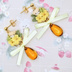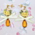 ご覧いただきましてありがとうございます。 樹脂粘土製のパーツとチャーム、サテンリボンを使用した耳飾りです。 動くと雫形のガラスビーズが耳元で揺れるデザインになってます。 淡い黄色のリボン、オレンジイエローのガラスビーズの組み合わせがとってもきれいですよ! 写真ではスタッドピアス(サージカルステンレス)でお仕立てしていますが、お好きなパーツへの変更も無料で承ります。 ご希望のパーツを選択していただきますようお願いいたします。 サフィックス社のスウェットバリアを使用しての金属アレルギー対応も可能です。 ご希望の方は右のメニューより「金属アレルギー対策有」の項目を選んでください。 ※注意※ ☆お花のパーツは樹脂粘土でできています。性質上強い力や水濡れに弱いので、やさしいお取り扱いをお願い致します。 ☆定形外郵便でのお届けのみとなります。 【Size】 ・ブーケ:約1.5cm×1.2cm ・雫形ガラスビーズ:13mm×8mm