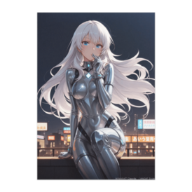 ポスター - B2この商品はpixivFACTORYで作られた商品です。サンプル画像は完成イメージのため、実物と異なる場合があります。 夜風に揺れる白銀の髪と、メタリックなスーツが輝くサイバー系ヒロインを描いたイラスト風ポスターです。未来都市を背景に、静かで優しい表情が生み出すクールさと透明感が魅力の一枚。SF・近未来アートが好きな方におすすめの作品です。