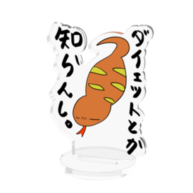 アクリルフィギュア - 50x50mmダイエットとは無縁の、ぽってりボディが愛らしいUMA「つちのこ」のアクリルスタンド! デスクや玄関で、ゆるい癒やしと強い意志(?)を放ちます。 【詳細】 ・ゆるっと脱力系!:つぶらな目と、一切の迷いを捨てたような表情がたまらない、個性的なつちのこのイラストをアクリルスタンドにしました。 ・メッセージ性も抜群!:「ダイエットとか 知らんし。」という力強い(?)メッセージは、仕事の休憩中や、ちょっと疲れた時に見るとクスッと笑えて元気になれます。自分を甘やかしたい時のお供にどうぞ。 ・どこに飾る?:デスクの上、本棚、玄関など、場所を選ばず飾れるサイズ感。毎日あなたの頑張りを見守って(?)くれます。 ・プレゼントにも:「ダイエット疲れの友人へ」「蛇やUMA好きのあの人へ」など、ユニークなプレゼントとしてもおすすめです。 【商品仕様】 サイズ:50mm×50mm 素材:アクリル 印刷:UVインクジェット印刷