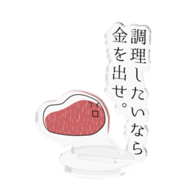 アクリルフィギュア - 50x50mm『調理したいなら金を出せ。』 食卓に並ぶその時を、静かに待ち望む肉のアクリルスタンドです。 強い意志と、肉汁あふれるフォルムがあなたのデスクを彩ります。 料理を前にした時の、あの「待てない」気持ちを具現化しました。 こんなところにどうぞ! ・キッチンや食卓に置いて、料理への熱意を高める ・デスクに置いて、仕事のやる気と「金」への執着を高める ・推し活グッズと一緒に並べて、推しへの愛を表現 ※このアクリルスタンドは食べられません。 【商品仕様】 サイズ:50mm×50mm 素材:アクリル 印刷:UVインクジェット印刷