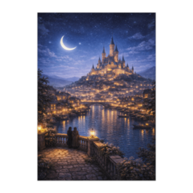 ポスター - B2この商品はpixivFACTORYで作られた商品です。サンプル画像は完成イメージのため、実物と異なる場合があります。 三日月の下、無数の灯りに照らされた幻想王国の夜景。 水面に映る光と静かな夜空が、物語の終章をやさしく彩ります。 シリーズの締めくくりにふさわしい、 深い余韻を残すファンタジーアートです。