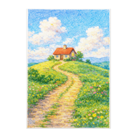 ポスター - B2この商品はpixivFACTORYで作られた商品です。サンプル画像は完成イメージのため、実物と異なる場合があります。 丘の上へ続く小さな道の先に、ぽつんと建つ小さな家。 クレヨンと色鉛筆で描いたような、やさしく温かい海外絵本風の風景です。 空の広さ、草花の色、ゆっくり流れる時間。 見ているだけで心がほどけるような、癒しの一枚。 お部屋のインテリアとしてはもちろん、 スライドショーや動画のワンシーンにもおすすめです。