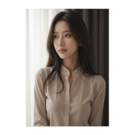 ポスター - B2この商品はpixivFACTORYで作られた商品です。サンプル画像は完成イメージのため、実物と異なる場合があります。 柔らかな自然光に包まれた、清潔感あふれるエレガントな女性ポートレート。 淡いベージュのブラウスと落ち着いた表情が、穏やかで上品な雰囲気を引き立てます。 日常にそっと寄り添うような、静かで洗練された一枚です。
