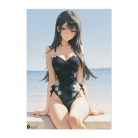 ポスター - B2この商品はpixivFACTORYで作られた商品です。サンプル画像は完成イメージのため、実物と異なる場合があります。 深みのあるブラックを基調とした柄が印象的な、上品なワンピース水着のアートポスター。 穏やかな海と空を背景に、落ち着いた大人の美しさと健康的なスタイルを表現しています。 シックで洗練された雰囲気は、空間を選ばず飾りやすい一枚です。