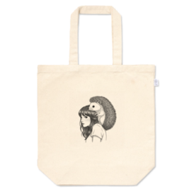 トートバッグ - M - プリント面積中頭の上にハリネズミを乗せた女の子の、お洒落なモノクロイラストをトートバッグにしました。 しっかりとしたキャンバス生地で、A4サイズも入る使い勝手の良い大きさ。お買い物や通勤・通学のサブバッグにもぴったりです。シンプルで大人可愛いデザインをお楽しみください。