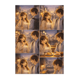 ポスター - B2この商品はpixivFACTORYで作られた商品です。サンプル画像は完成イメージのため、実物と異なる場合があります。 待ち合わせから始まる、何気ない一日のデート。 街を歩き、会話をして、カフェで食事をして、 最後は手を振って別れるだけの、特別な出来事。 派手な展開はなくても、 「楽しかったな」「また会いたいな」 そんな余韻だけが、静かに残ります。 6つの場面を1枚にまとめた、 物語を感じるイラストポスターです。