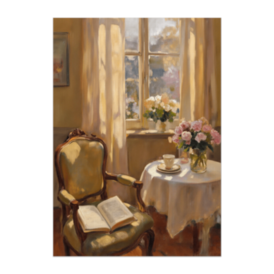 ポスター - B2この商品はpixivFACTORYで作られた商品です。サンプル画像は完成イメージのため、実物と異なる場合があります。 窓辺のテーブルと椅子に残された、本とカップを描いた油絵風アートです。 人物は描かれていませんが、 そこに誰かが過ごしていた気配や時間の余韻を感じさせます。 光・花・布の質感がやさしく調和し、 落ち着いた空間づくりに適した一枚です。