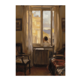 ポスター - B2この商品はpixivFACTORYで作られた商品です。サンプル画像は完成イメージのため、実物と異なる場合があります。 室内から、窓の向こう側に立つ人物の後ろ姿を描いた油絵風アートです。 柔らかな光に包まれた部屋の内側と、外の空気感との対比が、 距離や静かな時間の流れを感じさせます。 見る人によって、待つ時間なのか、別れの余韻なのか、 さまざまな物語を想像できる一枚です。