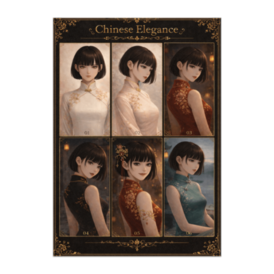 ポスター - B2この商品はpixivFACTORYで作られた商品です。サンプル画像は完成イメージのため、実物と異なる場合があります。 伝統的なチャイナドレスをテーマに、 同一人物を6つの装いと構図で描いた 統合アートポスターです。 正面・斜め・横顔などの構図変化に加え、 色彩や刺繍表現、背景の雰囲気を切り替えることで、 一人の女性が持つ多面的な魅力を 静かで上品なトーンで表現しています。 落ち着いたインテリアや、 アジアンテイストの空間にも馴染む 鑑賞用アートポスターとしてお楽しみください。