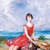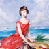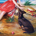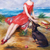 海辺で犬と一緒の赤いドレスの少女