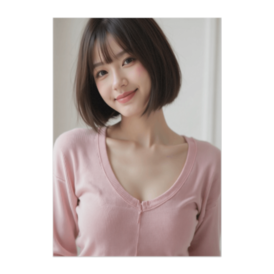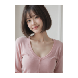 首を傾けて微笑むボブヘアの女性(ピンクニット)