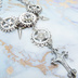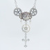 幾重にも重なる時の歯車と気高く煌めく祈りの造形 あなたの装いに圧倒的な存在感と幻想的な世界観を添えるペンダントです 深みのあるアンティークシルバーカラーを基調とし、精密な機械仕掛けを思わせる歯車と、端正な装飾が施されたロザリオを巧みに組み合わせました どこか懐かしく、それでいて未来的なスチームパンクの空気感と静謐なゴシック調の美学が共鳴し合う独創的な一点に仕上げています 「緻密な意匠が織りなす多層的でドラマチックな輝き」 このアイテムの主役は中央部に配置した大きめのラインストーンです 重厚なメタルの歯車の中に、クリアで力強い輝きを埋め込むことで胸元でひときわ眩い光を放ち、視線を惹きつけるポイントを作りました 周囲に配したスパイクパーツや小さな歯車たちが奥行きを生み出し多層的で立体感のある豊かな表情を見せてくれます ゆったりとした長めのロングネックレス仕様のためシンプルなトップスの上からでもバランス良く、スタイル全体をドラマチックに引き締めてくれます 甘さを抑えた凛々しい佇まいはレディースはもちろんメンズにもおすすめできるユニセックスな仕上がり 性別を問わず自分だけのこだわりを表現したい日の主役ジュエリーとして、手仕事ならではの緻密な造形美をぜひお手元でお楽しみください 「こんな方におすすめ」 スチームパンクやゴシックな世界観を、ファッションの主役に取り入れたい方 歯車やロザリオなど、複数のモチーフが重なるデコラティブなデザインを好む方 大きめのラインストーンによる、メタルの重厚感と光のコントラストを楽しみたい方 シンプルな装いを一気に華やかに見せてくれるロングネックレスを探している方 パートナーとシェアしたり、ペアで身に着けたりできるクールなユニセックス小物を求めている方 「お手入れ方法」 ご使用後は、柔らかい布で皮脂や汚れを優しく拭き取ってください。中央のラインストーンや複雑に組み合わさった細かなパーツは非常に繊細ですので、衣服への引っかかりや強い衝撃には十分ご注意ください。アンティーク調の風合いを長く保つため、水濡れや汗、化粧品との接触を避け、湿気の少ない場所で大切に保管することをおすすめします ※モチーフは亜鉛合金にメッキ加工、チェーンは鉄製にメッキ加工です。金属アレルギーの方はご注意ください ※チェーンの長さは標準で約50cmですが60cmに変更が可能です 「材質」 モチーフ:亜鉛合金:メッキ加工 ラインストーン チェーン:鉄製:メッキ加工 「大きさ」 中央部歯車サイズ:約直径18mm ロザリオサイズ:約28mm×18mm チェーンの長さ:約50cm+アジャスター(約5cm) 「重量」 約25.6グラム ※ご使用のモニターの色の違いにより、実際の商品と色味が若干異なる場合がございます。予めご了承ください NA-NK258