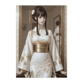 ポスター - B2この商品はpixivFACTORYで作られた商品です。サンプル画像は完成イメージのため、実物と異なる場合があります。 白と金を基調とした和装が美しく映える、全身構図の作品です。 落ち着いた室内空間と鏡の存在が、奥行きと静けさを演出しています。 気品と柔らかさを併せ持つ、鑑賞向けの一枚です。