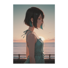 ポスター - B2この商品はpixivFACTORYで作られた商品です。サンプル画像は完成イメージのため、実物と異なる場合があります。 夕陽が海に沈む時間帯を背景に、ボブヘアの女性を描いたイラストです。 落ち着いた色合いの中にさりげない差し色が入り、上品で洗練された印象に仕上がっています。 シンプルながら存在感のあるアートとして、空間を静かに彩ります。
