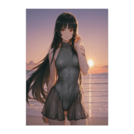 ポスター - B2この商品はpixivFACTORYで作られた商品です。サンプル画像は完成イメージのため、実物と異なる場合があります。 夕陽を背に、静かに佇む女性を描いたアニメイラスト風ポスターです。 ダークトーンの水着と透け感のあるスカートが、 大人っぽさと繊細さを演出します。 落ち着いた雰囲気を楽しみたい方におすすめの一枚です。