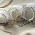 花柄生地で紐部分を作成、レトロで可愛いレースには顔回りが華やかになるようにフリルをつけました。 紐部分はリボンにしやすい長さにしてあります。