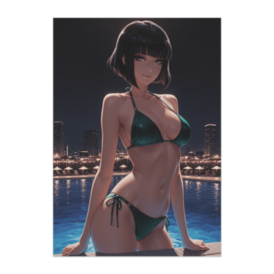 ポスター - B2この商品はpixivFACTORYで作られた商品です。サンプル画像は完成イメージのため、実物と異なる場合があります。 夜景とプールの光が印象的なナイトシーンに佇む、クールなボブヘア女性を描いたポスターです。落ち着いた都会的な雰囲気で、お部屋のアクセントにおすすめの一枚です。
