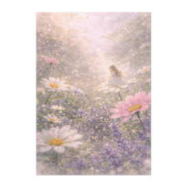 ポスター - B2この商品はpixivFACTORYで作られた商品です。サンプル画像は完成イメージのため、実物と異なる場合があります。 低い視点から広がる花畑と、小さく浮かぶ妖精を描いた幻想ポスターです。 花のやさしい色彩と光の粒が重なり、穏やかで落ち着いた空気感を楽しめます。 ナチュラルで優しいインテリアにおすすめの一枚です。