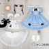 1.ワンピース(ファスナータイプ) 2.ねこみみカチューシャ 3.しっぽ付きエプロン 4.カフス(スナップボタンタイプ) 5.パニエ(ゴムタイプ) 6.ソックス 特典:ねこ型プレート、ミニチュアティーポット、アクリルカード