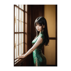 ポスター - B2この商品はpixivFACTORYで作られた商品です。サンプル画像は完成イメージのため、実物と異なる場合があります。 深い翡翠グリーンのチャイナドレスをまとった女性が、柔らかな自然光に包まれる窓辺に立つポスター作品。 上品な刺繍と落ち着いた色合いが、東洋の美しさと静かな気品を引き立てます。 クラシックな室内と自然光のコントラストが、穏やかで洗練された雰囲気を生み出しています。 インテリアポスターとして、落ち着いた空間や和モダンな部屋にもよく合う作品です。