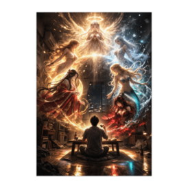 ポスター - B2この商品はpixivFACTORYで作られた商品です。サンプル画像は完成イメージのため、実物と異なる場合があります。 小さなワンルームの部屋。 ちゃぶ台の前でおにぎりを持つ男の周囲に、 六人の神秘的な存在が現れる。 天使、月姫、人魚、氷の女神、ヴィーナス、赤い魔女。 光と魔法が円環のように空間を包み込み、 日常の部屋が壮大な神話の舞台へと変わっていく。 幻想と日常が融合した、 壮大なファンタジーアートポスター作品です。