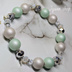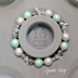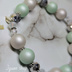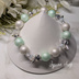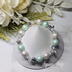 樹脂パール、ガラスビーズ、メタルパーツ、ブレスレット用ゴムを使用しています