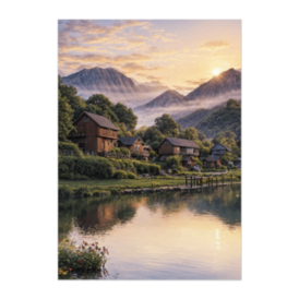 ポスター - B2この商品はpixivFACTORYで作られた商品です。サンプル画像は完成イメージのため、実物と異なる場合があります。 静かな湖のほとりに佇む山村と、遠くの山々に沈む夕日の光が美しい風景アートです。 水面に映る景色と穏やかな村の佇まいが、落ち着いた癒しの雰囲気を演出します。 ナチュラルインテリアやリラックス空間にぴったりの風景ポスターです。