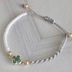 クローバーの形の繊細なパーツとパールビーズを組み合わせ、カジュアルにもフォーマルにも使っていただける概念カラーブレスレットを作りました。 コードの片側がすべてビーズなので、心ときめくキラキラ感です✨ セレモニーなどの場面でもぜひご活用ください🌸 お守りのように、毎日推しカラーを身につけてすごしませんか?🥰💚💙 *ワックスコード(ロウ引き)の素材なので、ある程度水に濡れても大丈夫ですが、入浴などの際には外してください。 (お湯につけるとロウが溶けてしまいます) *付け始めはコードが少々硬く感じられる場合がありますが、数回の使用で馴染んで柔らかくなります。 *手作業でひとつひとつ編み上げるため、発送までにお時間をいただきますことをご了承ください。