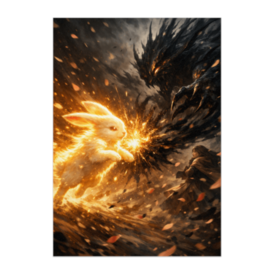 ポスター - B2この商品はpixivFACTORYで作られた商品です。サンプル画像は完成イメージのため、実物と異なる場合があります。 光をまとったうさぎが闇の怪物に立ち向かう、迫力ある戦闘シーンを描いたポスター作品です。 爆発する光と闇がぶつかり合う瞬間を切り取り、強烈なエネルギーと緊張感を表現しています。 物語のクライマックスとなる戦闘シーンとして、シリーズの中でも最もダイナミックな一枚です。 幻想的でありながら力強いビジュアルが、空間にインパクトを与えます。