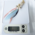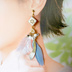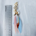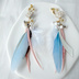 巴形薙刀をイメージした耳飾りです。 金具部分を除き全長は約12cm、金具を含めた片耳の重さは約9gです。 デザインボタン、樹脂粘土(裏部分)、鳥の羽、メタルパーツ、ガラスパール、チェコビーズを主に使用しています。