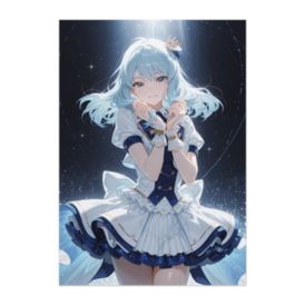 ポスター - B2この商品はpixivFACTORYで作られた商品です。サンプル画像は完成イメージのため、実物と異なる場合があります。 静かな輝きをまとい、やさしく微笑むブルーヘアのアイドル。 澄んだ光と幻想的なきらめきが、透明感あふれる美しさを引き立てます。 落ち着きと可愛さを兼ね備えた、心を癒す一枚です。 空間に上品で爽やかな雰囲気を添えてくれるアートポスターです。