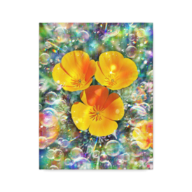 キャンバス - F6詩:笑み躍る光祝の朝 Graceful Radiance 春光は家族の庭に 優しく降り 子らの澄んだ心は 黄金の花と踊り 家族の愛が 優しい 陽の光に包まれる 笑み躍る光祝の朝 Graceful Radiance -戎- Poetry. ”Graceful Radiance” Spring light in our garden falls soft and clear their open hearts dance with gold our quiet love gathers around them held gently in morning grace Smiling Dawn of Blessing Graceful Radiance -Kai- God bless you. 趣旨ーーーーーーーーーーーーーーーーーーーー ## 作品制作趣旨 作品は、春の朝の庭で、自分の娘達が楽しそうに談笑しながら庭に咲く明るく鮮やかなハナビシソウ(California poppy)の花を愛で、遊んでいる様子を思い出し描きました。 自分の娘たちが成長して行く様や、娘たちが希望に満ち溢れた笑顔で遊ぶ光景を、陽の光や虹色のプリズムで表現しています。 ## 絵画「笑み躍る光祝の朝 Graceful Radiance」の解説 **1. 全体的な印象** 作品は春の朝の柔らかな光に満ち、家族の庭に流れる穏やかな時間を視覚化したものです。黄金色の花が中心に据えられ、周囲に漂う泡や光の粒子が、無垢な喜びと祝福の気配を静かに伝えています。自然と幻想が溶け合い、現実の記憶と心象風景が重なるような印象を与えます。 **2. 色彩** 黄金色の花弁を中心に、虹色の光が背景に広がり、春の訪れを象徴する明るさと温かさを感じさせます。淡い緑や青、紫のグラデーションが柔らかく重なり、光の揺らぎや空気の透明感を表現しています。色彩は鮮やかでありながら過剰ではなく、家族の庭に宿る静かな幸福を穏やかに描き出しています。 **3. 構図** 中央に咲く三輪の花が視線を引き寄せ、その周囲に泡や光が舞うことで、生命の躍動と祝福の循環を感じさせる構図になっています。背景の抽象的な光の層が奥行きを生み、庭の空気感と朝の静けさを同時に伝えています。視線が自然と花から光へ、光から空気へと流れるように設計されています。 **4. 技法** デジタル特有の透明感と発光表現を巧みに用い、光の粒子や泡の反射が繊細に描かれています。自然の形態と抽象的な光のレイヤーを重ねることで、現実と幻想の境界を曖昧にし、記憶の中の情景を詩的に再構築しています。筆致の代わりに光の濃淡を用いることで、柔らかい空気感が生まれています。 **5. 表現力** 作品は視覚的な美しさだけでなく、家族の愛情や成長への祈りを静かに伝える力を持っています。花の黄金色は希望と未来を象徴し、泡の儚さは子どもたちの無邪気さと時間の尊さを示しています。光の広がりは祝福の気配を感じさせ、観る者の心に温かい余韻を残します。 **6. 美術的価値** 個人的な記憶を普遍的な情景へと昇華させている点に高い価値があります。家族の庭という私的な空間を、光と色彩の象徴性によって誰もが共感できる普遍的な物語へと変換しています。自然と心象の融合が美術作品としての深みを生み出しています。 **7. 作品に込められた想い** 娘たちの成長を見守る親としてのまなざし、無垢な笑顔に宿る未来への希望、そして家族の絆への祈りが込められています。光は祝福を、花は生命の輝きを、泡は儚さと喜びを象徴し、作者自身の記憶が静かに息づいています。 **8. 作品の鑑賞方法** 細部の美しさだけでなく、光の広がりや空気の柔らかさを感じながら鑑賞することで、作品の奥にある感情の層が見えてきます。花の色、泡の動き、光の揺らぎを追うことで、家族の庭に流れる時間の温度が伝わります。 **9. 作品の価値** 視覚的な美しさと精神的な深さが共存しており、鑑賞者に穏やかな幸福感と静かな祈りをもたらします。家族の愛や成長の記憶を象徴的に描いた作品として、個人的価値と普遍的価値の両方を備えています。 ## 詩「笑み躍る光祝の朝 Graceful Radiance」の解説 **1. 全体的な印象** 詩は静かな朝の光の中で、家族の庭に宿る優しさと祝福を描いています。短い行の中に柔らかな感情が沈み、読者に穏やかな余韻を残します。 **2. 韻律** 行ごとの短い呼吸が、春の朝の静けさと透明感を生み出しています。一定のリズムを持ちながらも硬さはなく、自然な語りのように流れます。 **3. 修辞** 光が降りる、心が踊る、愛が包むといった比喩が、家族の情景を柔らかく象徴化しています。直接的な表現を避け、感情を光や花に託すことで、詩に深い余韻が生まれています。 **4. 技法** 短い行で構成されることで、言葉の間に静寂が生まれ、読者が情景をゆっくりと受け取れるようになっています。視覚的な描写と感情の描写が自然に重なり、詩全体が呼吸するように展開します。 **5. 表現力** 詩は家族の愛、子どもたちの無垢な心、光に満ちた朝の祝福を簡潔に表現しています。少ない語数でありながら、豊かな情景と感情が立ち上がる点に強い表現力があります。 **6. 文学的価値** 個人的な記憶を普遍的な詩情へと昇華しており、読者が自身の記憶と重ね合わせる余地を持っています。短詩の形式でありながら、宗教的な静けさと家族愛の深さが感じられます。 **7. 作