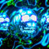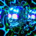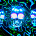 サイバーネオンスカルが対称的に配置された、未来的なVJループ映像です。