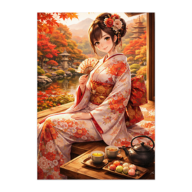 ポスター - B2【キャッチコピー】 「あなたのお部屋に、秋の深まりと心安らぐ和のひとときを。」 【作品紹介文】 息を呑むような紅葉に彩られた日本庭園。 木漏れ日が差し込む縁側で、華やかな花柄の着物をまとった少女が、温かいお茶と色鮮やかな和菓子と共にあなたを待っています。 幾重にも重なる紅葉の赤と金、そして着物の緻密で美しい柄が、空間をパッと華やかに彩ります。 少女の優しく微笑む表情と、背景に佇む五重塔が、日々の忙しさを忘れさせてくれるような「癒やし」と「ノスタルジー」を感じさせてくれる一枚です。 【こんな方・こんなシーンにおすすめです!】 お部屋のインテリアに、季節感や彩りを取り入れたい方 和風モダン、レトロな雰囲気がお好きな方 デスク周りや寝室に、ホッと一息つける「癒やしの窓」が欲しい方 高精細で美しい和服少女のイラストを堪能したい方 ポスターとして壁に飾れば、そこがあなただけの特別な秋の庭園に変わります。 ぜひ、この美しい秋の情景をお手元でお楽しみください。