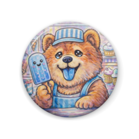缶バッジ - 57mmなぜかアイスを売っているチャウチャウ。 暑さに強いのか弱いのか、よくわからない。 ゆっくりとした動きで、 今日も黙ってアイスを差し出す。 溶ける前に渡しているのか、 それとも少し溶けてからが正解 なのか。 もふもふとひんやりのあいだで、 不思議な時間が流れている。