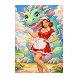 ポスター - B2この商品はpixivFACTORYで作られた商品です。サンプル画像は完成イメージのため、実物と異なる場合があります。 巨大なドラゴンの前で、なぜかいつも通りに接客ポーズを決めるウェイトレス。 ファンタジーの世界観とポップなキャラクターのギャップが楽しい、 明るくユーモラスなポスター作品です。 カラフルで優しい雰囲気のドラゴンと、 レトロなウェイトレスの組み合わせが印象的で、 お部屋を楽しく彩るインテリアとしてもおすすめです。