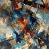 この抽象画は、人間の内面にある感情の複雑さと、それが引き起こす混沌と調和をテーマに描かれています。 画面全体を覆う、力強く、時に荒々しい筆致は、私たちの心の中で渦巻く様々な感情のエネルギーを表しています。深い青や黒は、不安や葛藤、そして深層心理を、鮮やかなオレンジや赤は、情熱、喜び、あるいは怒りを、そして金色やクリーム色は、希望、癒やし、あるいは光を象徴しています。 画面左側の、流れるような青と黄色の渦は、感情が激しく揺れ動く様子、あるいは感情に身を任せている状態を表しています。一方、右側の、幾何学的で直線的な構造は、理性や意志、あるいは感情をコントロールしようとする試みを表しています。 この二つの対照的な要素が衝突し、融合することで、画面全体に複雑なダイナミズムが生まれています。飛散する白い絵具は、予期せぬ出来事や感情の爆発を、あるいは一瞬のひらめきや希望を象徴しています。 この作品は、混沌とした感情の中にも、どこかに調和や美が存在すること、そして感情と理性の対話こそが、人間の生命力そのものであることを示唆しています。