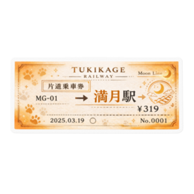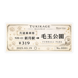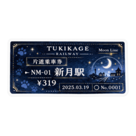 新月駅 行き夜へ向かうための、たった一枚の切符。🌙 月影鉄道「Moon Line」をモチーフにした 片道乗車券風ステッカーです。 行き先は3つ。 ・毛玉公園 ・満月駅 ・新月駅 どこへ行くかは、気分次第。 財布に入れても、スマホに貼っても、 その一枚が、少しだけ夜を近くしてくれる。 今日はどこ行く?🐾 この商品はpixivFACTORYで作られた商品です。サンプル画像は完成イメージのため、実物と異なる場合があります。