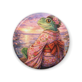 缶バッジ - 57mm見返り美人ガエルの缶バッジ。 ふと振り返る一瞬の美しさを切り取った、 どこか色気のあるカエル。 さりげない存在感で、持ち物に個性をプラスします。