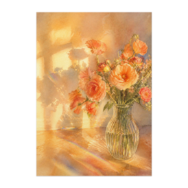 ポスター - B2この商品はpixivFACTORYで作られた商品です。サンプル画像は完成イメージのため、実物と異なる場合があります。 夕暮れの光に包まれた花束とガラスの花瓶を、水彩でやさしく表現した作品です。 オレンジ色の光と影、そして床に広がるプリズムの輝きが、温かく穏やかな時間を演出します。 落ち着いた空間やリビングのアクセントとしておすすめの一枚です。