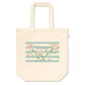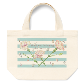 トートバッグ - M - プリント面積中カーネーションの部分に手書きの風合いを残したイラストを、水色のストライプを背景に、トートバッグにしました。 「Thank you for having discovered me」=「私を探し出してくれてありがとう」のメッセージを加えました。 洗濯も可能です(繰り返すことでの色落ちの可能性はあります)。 ★両サイズともマチ部分は9cm程で、ランチトートやサブバッグとしてご利用いただけると思います。 ★Mサイズで、背景・メッセージの無いものも、登録しています この商品はpixivFACTORYで作られた商品です。サンプル画像は完成イメージのため、実物と異なる場合があります。 ★Sサイズ 本体:4L /300mm×200mm 持ち手サイズ:25mm × 290mm マチ:90mm ★Mサイズ 本体:10L / 360mmx370mm 持ち手サイズ:25mm x 470mm マチ:90mm