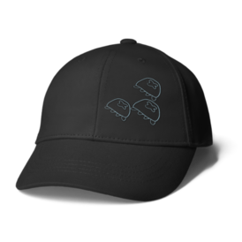 キャップ - ブラック暗闇でぷかぷか泳ぐくらげ達にはどんな世界が見えているのでしょうか 黒のキャップに水色のクラゲが3匹、Tシャツデザインの流用です。 クラゲに名前はありません、名付けてあげてください。