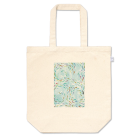 トートバッグ - M - プリント面積中消しゴムはんこを使って描いたイラストをトートバッグにしました。 ぐるぐる魚と水の中を泳ぐ猫の夢のイラストのトートバッグでお買い物も楽しい気分になれそうです! この商品はpixivFACTORYで作られた商品です。サンプル画像は完成イメージのため、実物と異なる場合があります。 トートバッグサイズM