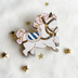 朝と夜の遊園地シリーズから、メリーゴーランドの木馬「るる」と「ひな」のブローチです。 夜の木馬(ぴんくのたてがみ):るる 朝の木馬(水色のたてがみ):ひな 木を切り出して作ったモチーフに、一つずつ着色して作っています。 木材にはそれぞれ木目や色味の違いがあり、一つとして同じものがありません。 そんなあたたかみのある、木の風合いも楽しんで頂ければ幸いです。 また、木材のためとても軽量で、重さをあまり感じさせまん。 表面は食品衛生法にも適合したニスでコート、裏面も油性のニスでコートしております。 (お水は弾きますが、長時間水に濡れるような環境や、水場でのご使用は念のためお控えくださいませ。) 背面にはゴールドの回転ピンが付いております。 普通のブローチピンよりも外れにくく、安心してお使いになれます* 仕様------------------------------------ 縦4.2cm 横4.5cmほどです。厚みは5mmほど。 画像の大きさ比較はB5サイズのノートです。 ご購入時の注意点----------------------------------- * 写真と色 * ご覧いただいているお写真と、実際の商品では少々色の違いがある場合がございます。 あらかじめご了承ください。