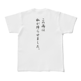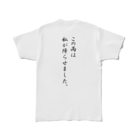 Tシャツ - XL - 白初めまして。 私は「ベランダから外を見る事」が雨乞いの儀式になるレベルの雨女なので、外に出る時はいつも申し訳ない気持ちでいたのですが、最近ちょっと吹っ切れましたので自供Tシャツを作りました。 私と同じような境遇の方の気が少しでも楽になれば幸いです。 宜しくお願い致します。 申し訳ありませんが、このTシャツで起きた騒動の責任は取れません、ご容赦くださいますようお願い致します。