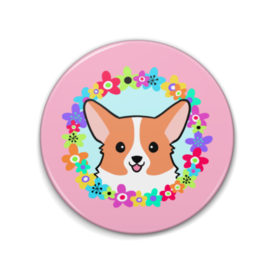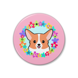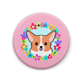 缶バッジ - 76mmフラワーリースからひょっこり顔を出しているコーギーの缶バッジです。 この商品はpixivFACTORYで作られた商品です。サンプル画像は完成イメージのため、実物と異なる場合があります。