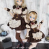 各パーツ独立して製作しておりますので色々アレンジして着用頂けます アレンジ着装の画像も載せてありますが、セット内容は下記のとおりです 【セット内容】 (1)オープンバストベスト (2)胸当て (3)付け襟 (4)スカート (5)アンダースカート (6)エプロン (7)付け袖 (8)カフス (9)ヘッドドレス (10)後ろリボン 【1・オープンバストベスト】 後ろマジックテープ開閉。見頃のみ裏地付き。 胸元の大きく開いた上着です。 【2・胸当て】 ③付け襟・⑥エプロンをマジックテープで取り付けれますのでお好みでアレンジして下さい。胸元に飾りがある方が前です。 【3・付け襟】 後ろスナップ止め。 ②胸当てにマジックテープで取り付けれます。 【4・スカート】 後ろマジックテープ開閉。⑥エプロンをマジックテープで取り付けれます。 【5・アンダースカート】 ウエストゴム仕様。 【6・エプロン】 ②胸当て・④スカートにマジックテープで取り付けれます。お好みで取り外しして下さい。 【7・付け袖】 ハンドパーツを外して着用下さい。 【8・カフス】 ハンドパーツを外して着用下さい。 【9・ヘッドドレス】 針金入りですので頭の形に整えて着用ください 【10・後ろリボン】 安全ピン仕様。後ろウエストに付けて下さい ※自宅で48時間のパッチテストをクリアした素材を使用し制作しておりますが、オビツ・DDボディーは素体の特性上色移りにご注意ください。 ※ソックス・星屑のショーツ(レースショーツ)・星屑のブラ(レースのブラ)は別売りです。